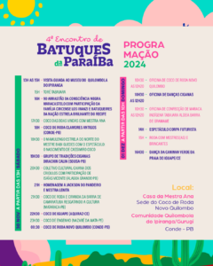 Com 18 horas de programação, o encontro inicia às 13h do sábado (30) com uma visita guiada ao Museu Quilombola da comunidade. A partir das 15h, apresentações culturais de grupos de diversas regiões da Paraíba e convidados de Pernambuco e Ceará animarão o público. Entre as atrações estão o Toré Tabajara, o 9º Arrastão da Consciência Negra do Maracastelo com a Família Circense Los Iranzi e Batuqueiros da Nação Estrela Brilhante do Recife, além de homenagens a Jackson do Pandeiro e à Mestra Lenita.