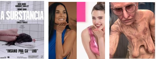 A atriz-produtora-diretora-modelo Demi Moore entrou em declínio após Striptease, mas – aos 62 anos – teve um retorno surpreendente com o filme A Substância (Coralie Fargeat, 2024), em que faz uma celebridade (de 50 anos) em decadência e passa usar uma substância química que promete rejuvenescimento, mas em verdade causa efeitos corporais aterrorizantes.