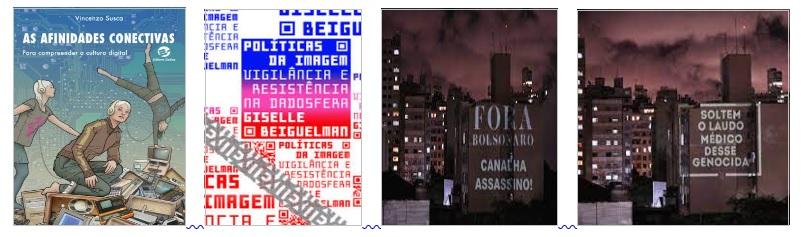E, pela via da estética, há a obra da artista-arquiteta-professora Giselle Beiguelman, Políticas da Imagem: vigilância e resistência na dadosfera (BEIGUELMAN, 2021), um primor nas táticas de usar a tecnologia para afugentar a distopia através de novas utopias urbanas. E é impressionante a obra-experimento Coronavida, pandemia, cidade e cultura urbana (2020) lançando encorajadoras mensagens poéticas em laser, durante o confinamento, nas grandes paredes da metrópole.