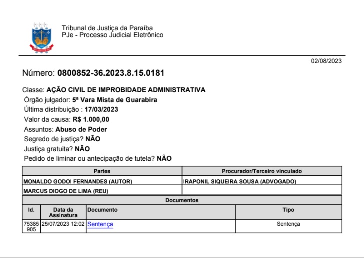 5ª Vara Mista de Guarabira julgou improcedente acusação de improbidade administrativa assinada por Monaldo Godoi.